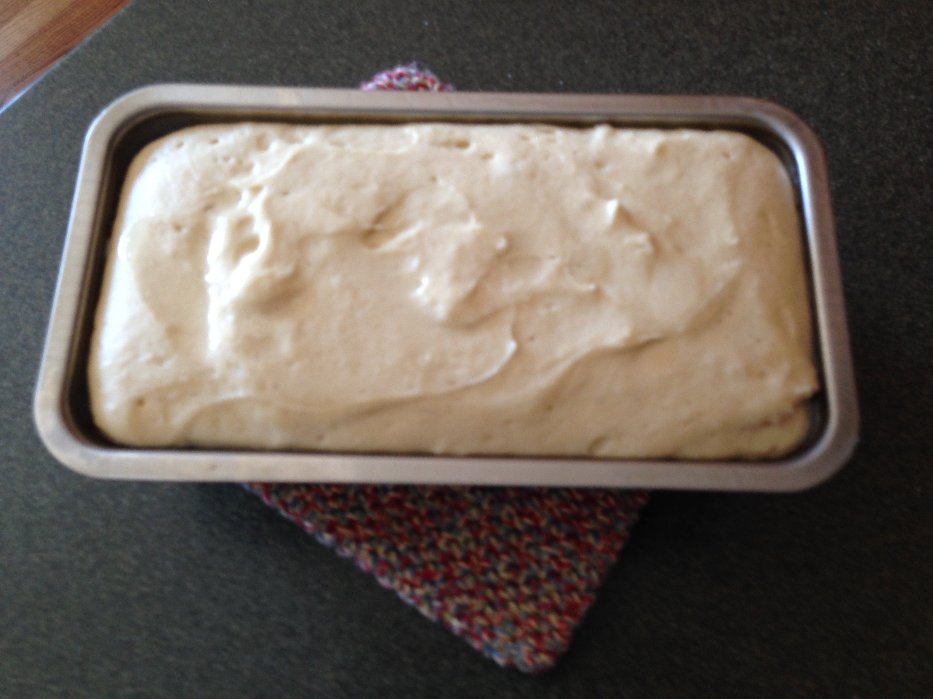 Cover: Let the batter rise for about one hour,  then pour into prepared loaf pan. (Greased and lined with parchment paper) Let bread rise again to top of pan and place in the oven at 350 degrees. Bake for 45-50 minutes. I did 50 minutes to make sure it was done.