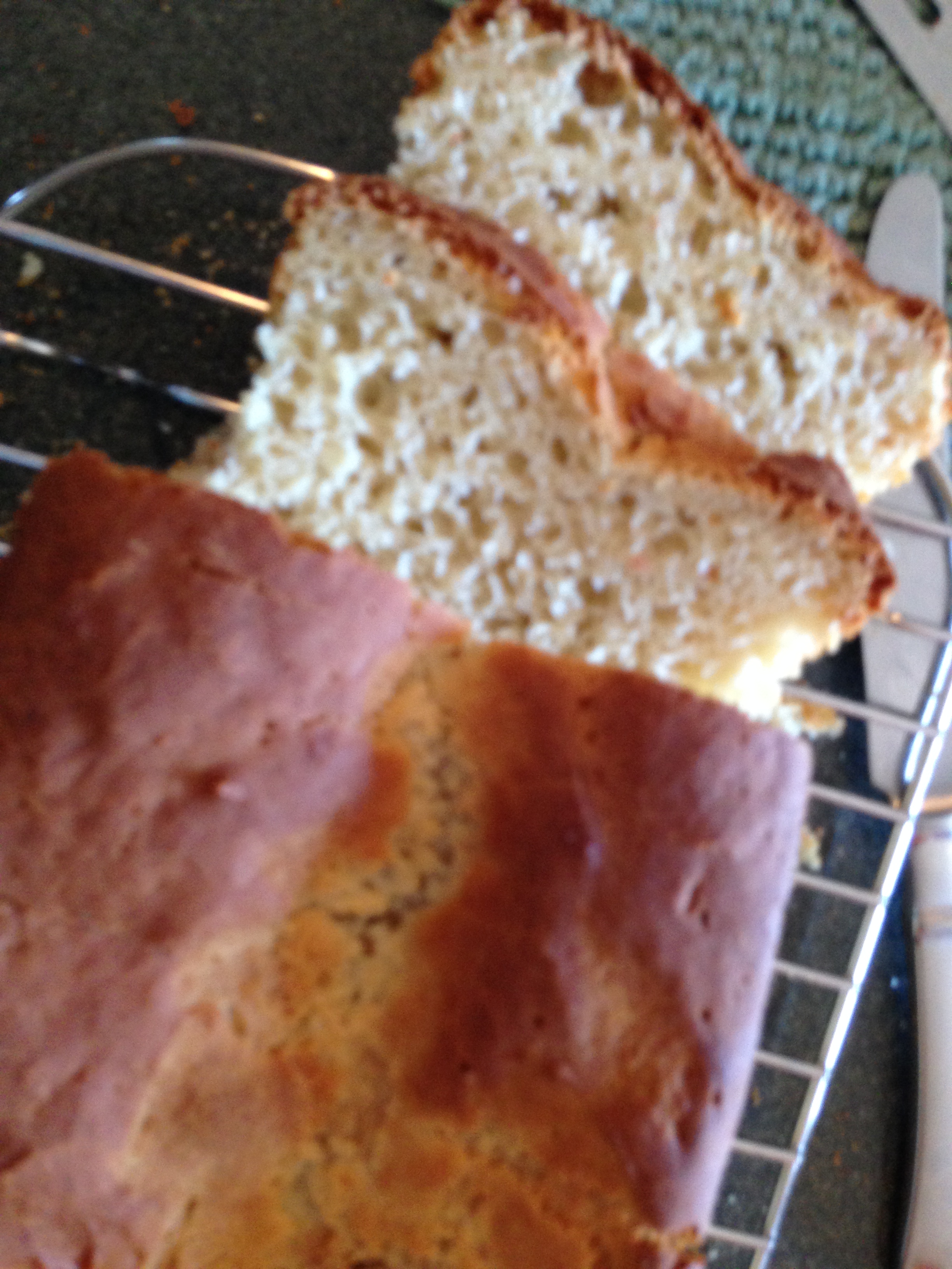 The recipe seemed simple enough and had ingredients that I could modify to fit a dairy free recipe. The challenge was could I make it without using potato starch. If you are someone who suffers from inflammation, potatoes and those pesky night shade foods are troublesome. Every mix, every baked good out there in the Gluten Free world seems to have Potato Starch! This recipe is very tasty but a bit crumbly. Part of the problem was not lining the pan with parchment paper. I decided to try greasing the pan but GF bread just sticks! Make sure you grease and line the pan with some parchment paper.